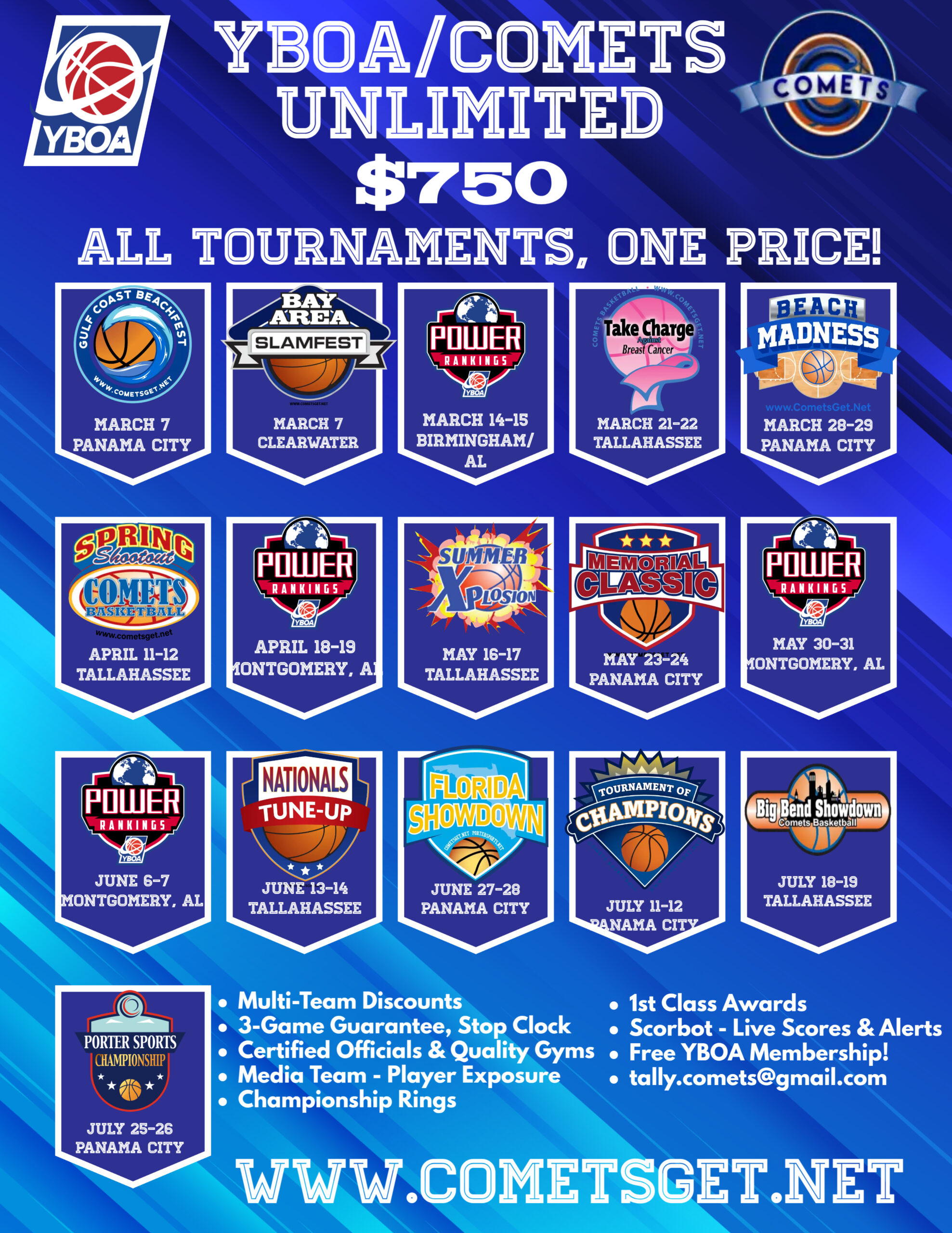 YBOA/Comets offer a limited time to purchase the YBOA/Comets UNLIMITED Package allowing your team to compete in a number of participating tournaments at a low price! Click here to learn more and take advantage! See your teams on the court!